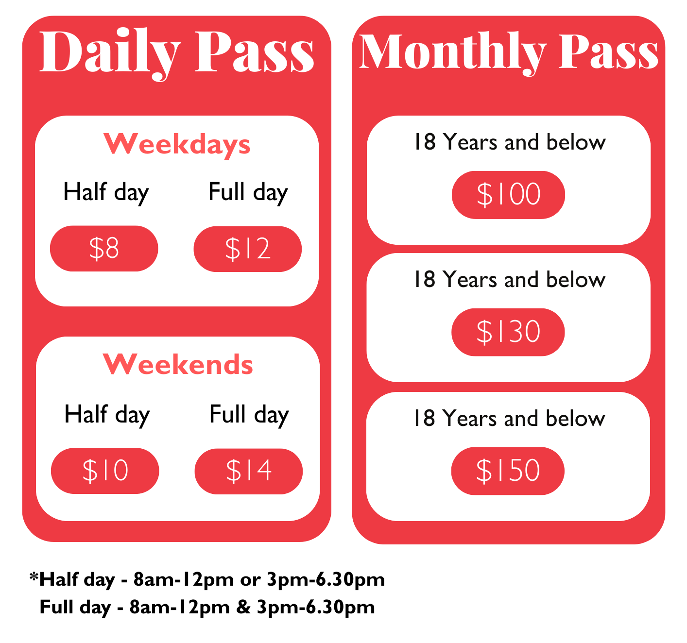 For riders 12 years old and below only. Up to 2 accompanying parent/guardian (non-riders) will be allowed complimentary entry in to the facility