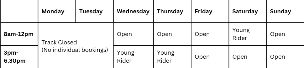 *Note that there is no provision of a Coach for all individual use slots. Use of the track is unsupervised.