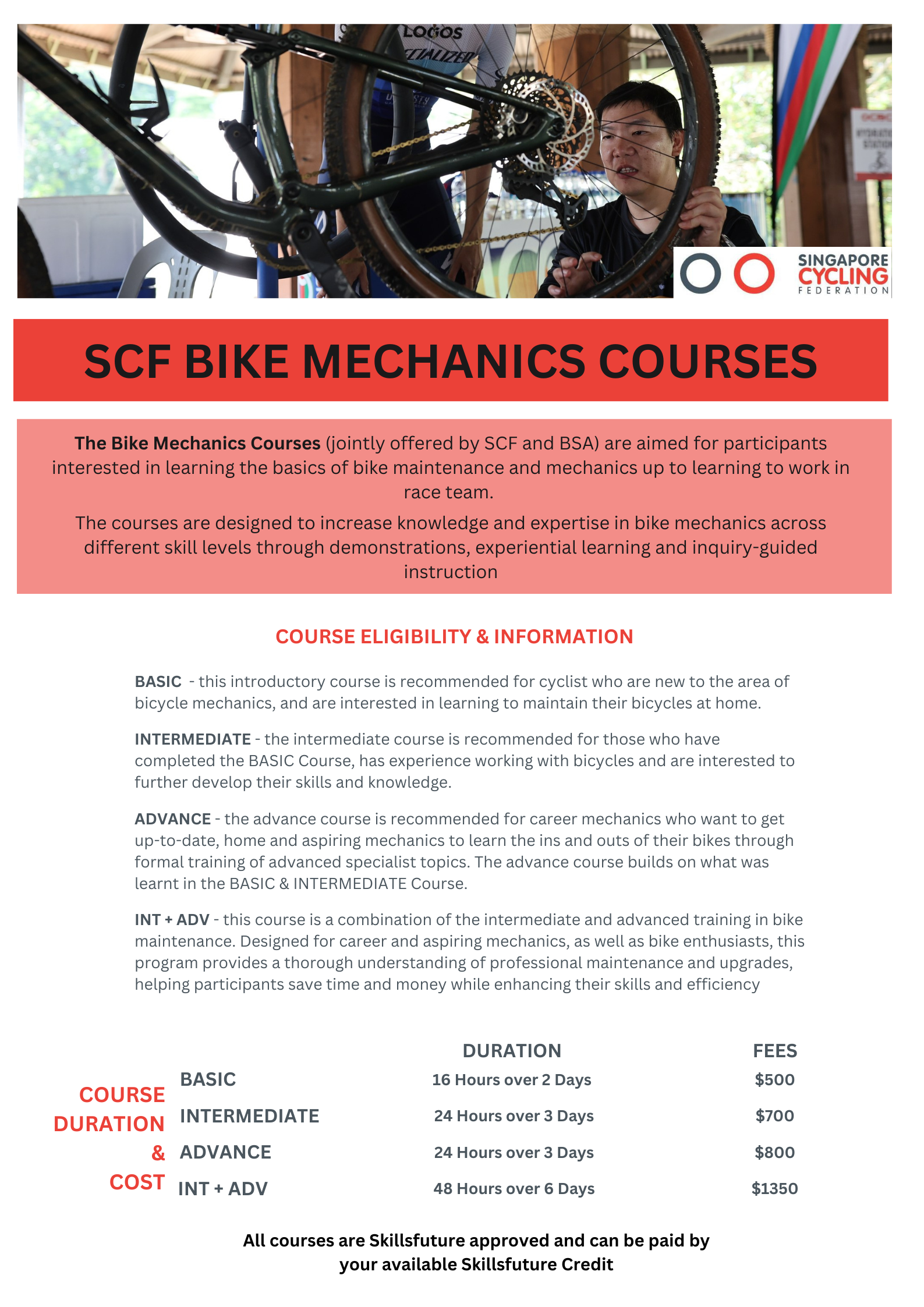 All mechanics course by Singapore Cycling Federation are skillsfuture verified. There are no subsidies, however, you may utilise your skillsfuture credits to pay for the cost of the course.